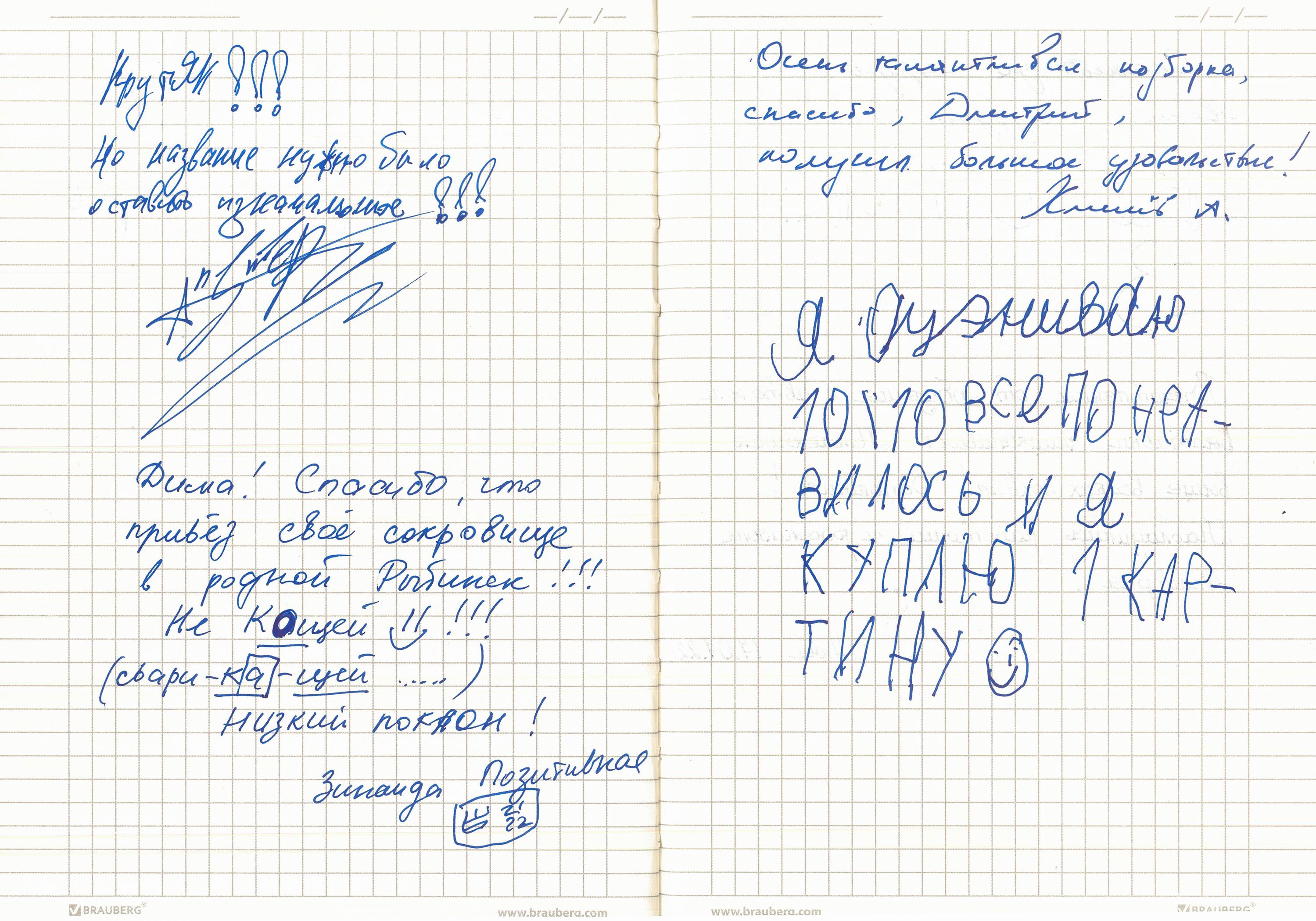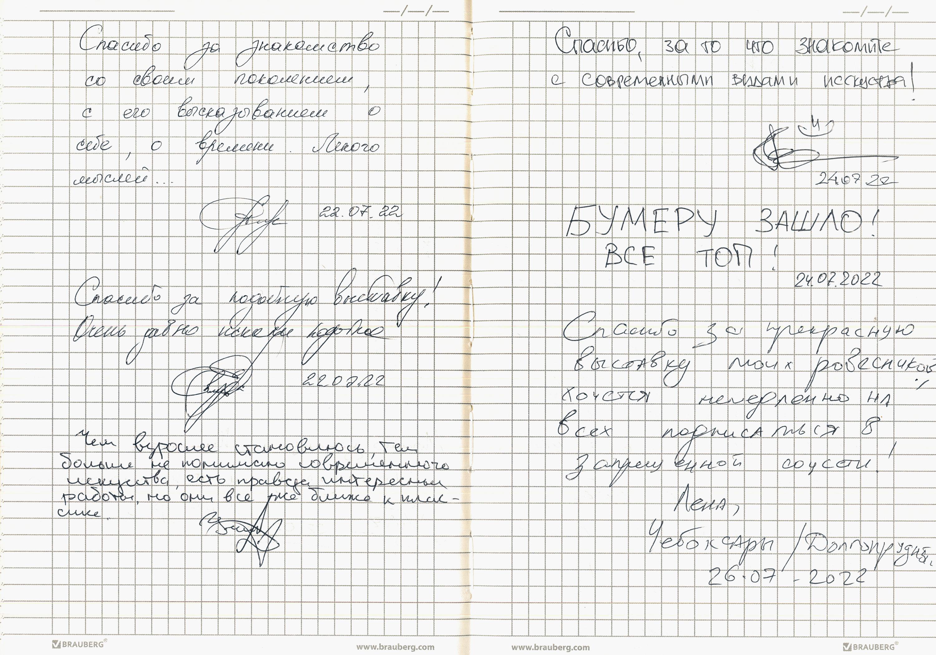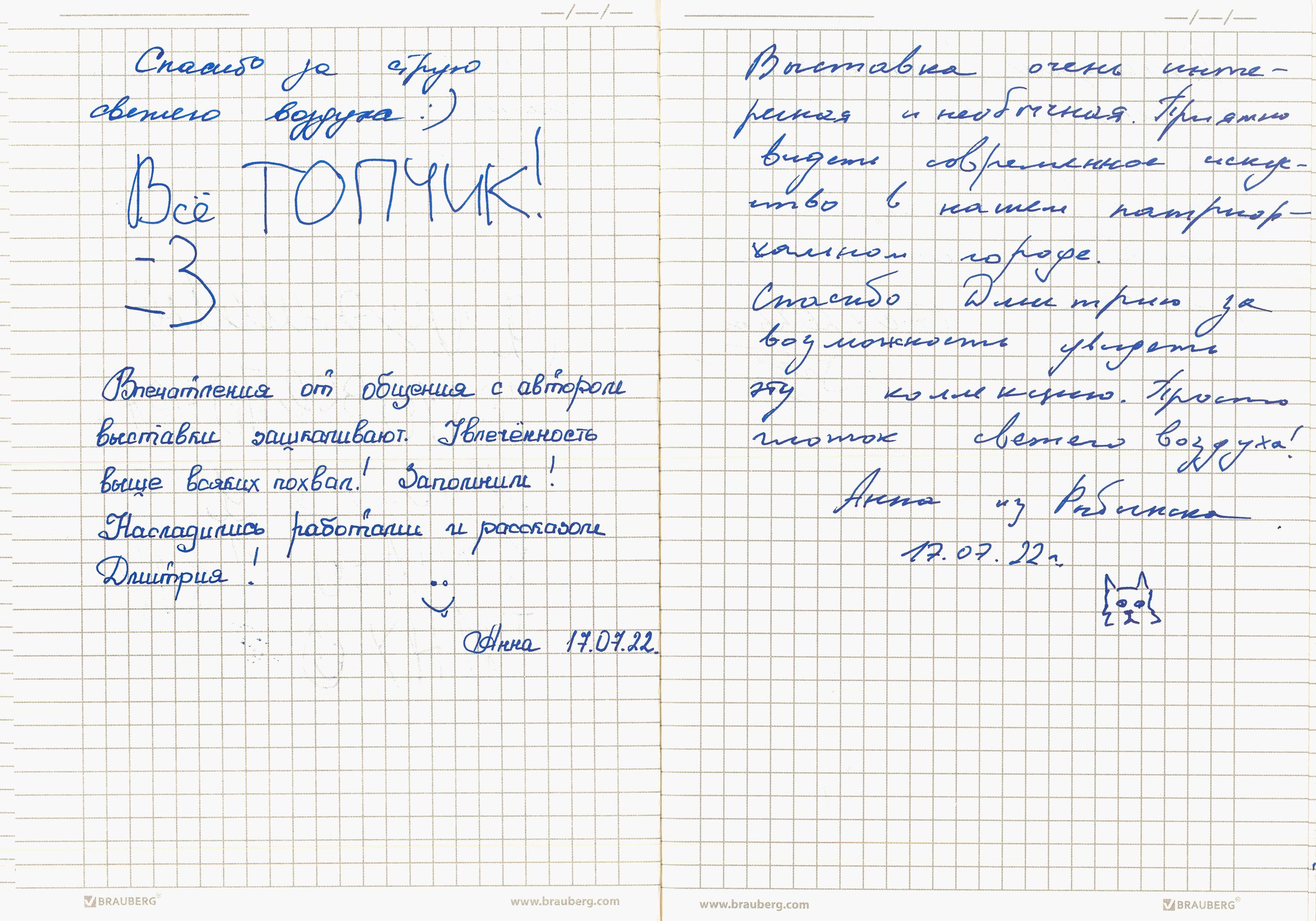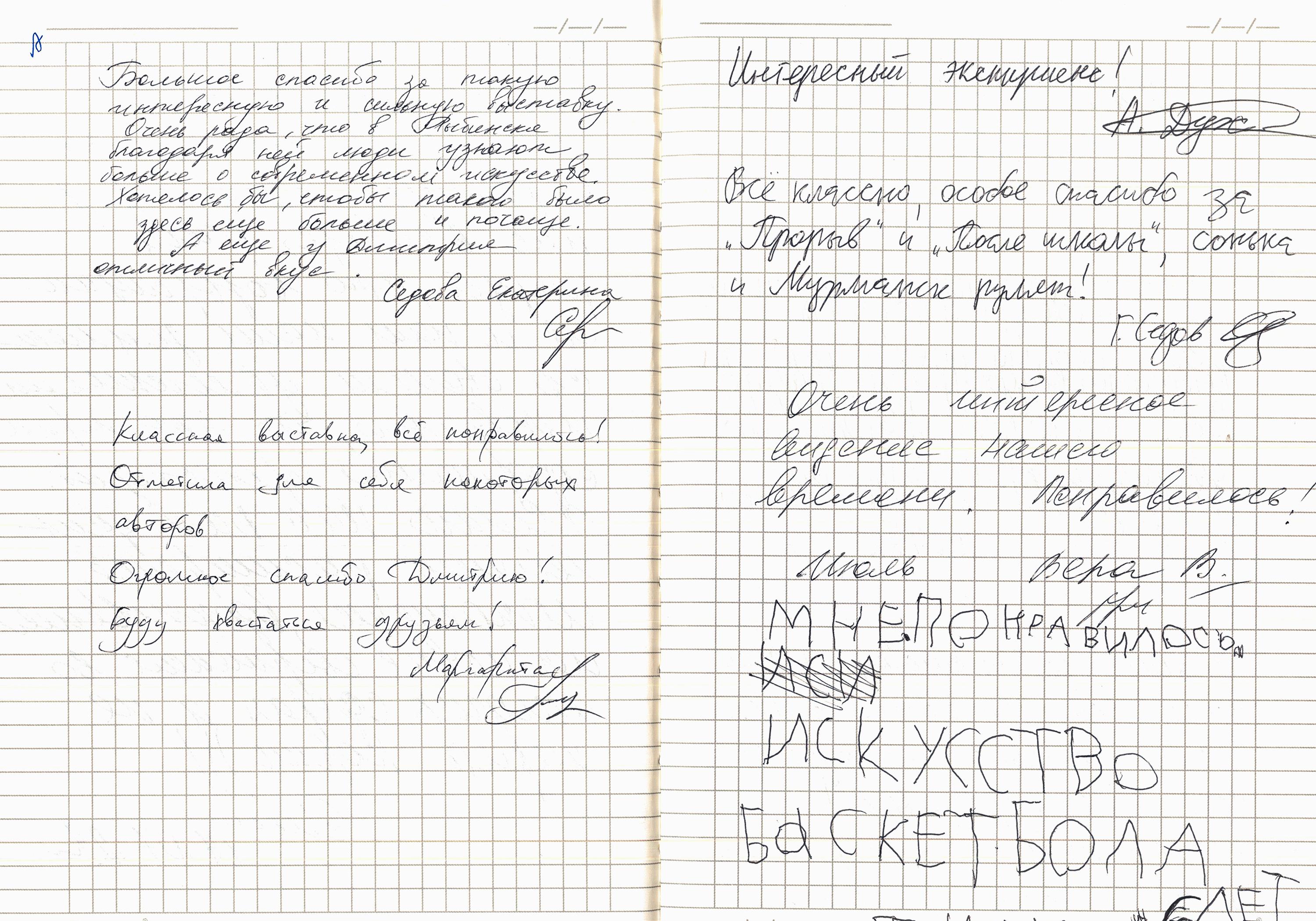 Самая популярная устная реакция на «Музейник» звучала приблизительно так: «В Рыбинске нечего делать, духота, а тут такое современное событие — класс! Сильно не хватает такого». Очень понятная история. В Москве во время «Квартирника», кажется, никто не жаловался на недостаток событийности. Также на выставке я решил положить блокнот для посетителей, которым проще формулировать свои мысли в письменной форме. Вот некоторые развороты из него: