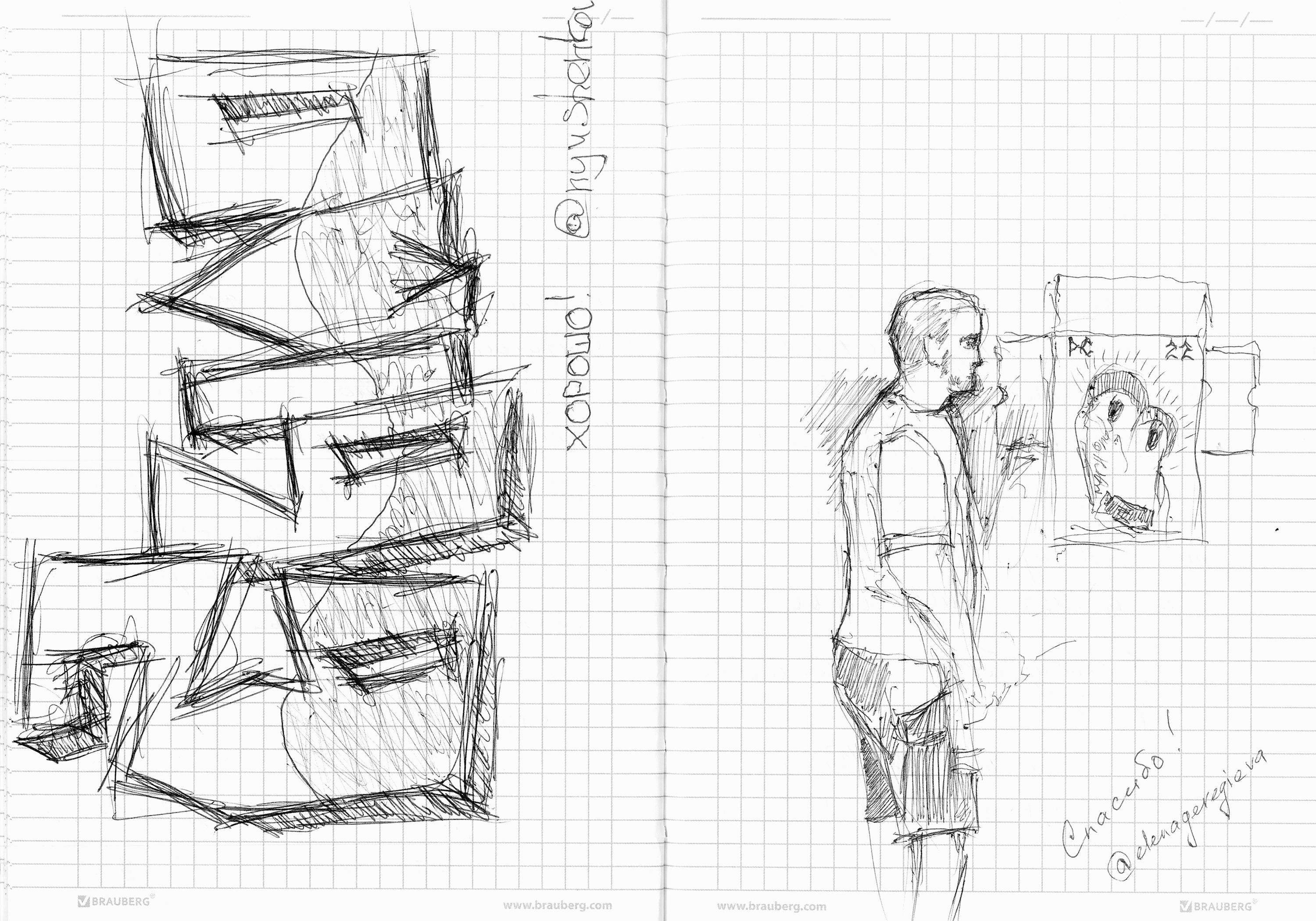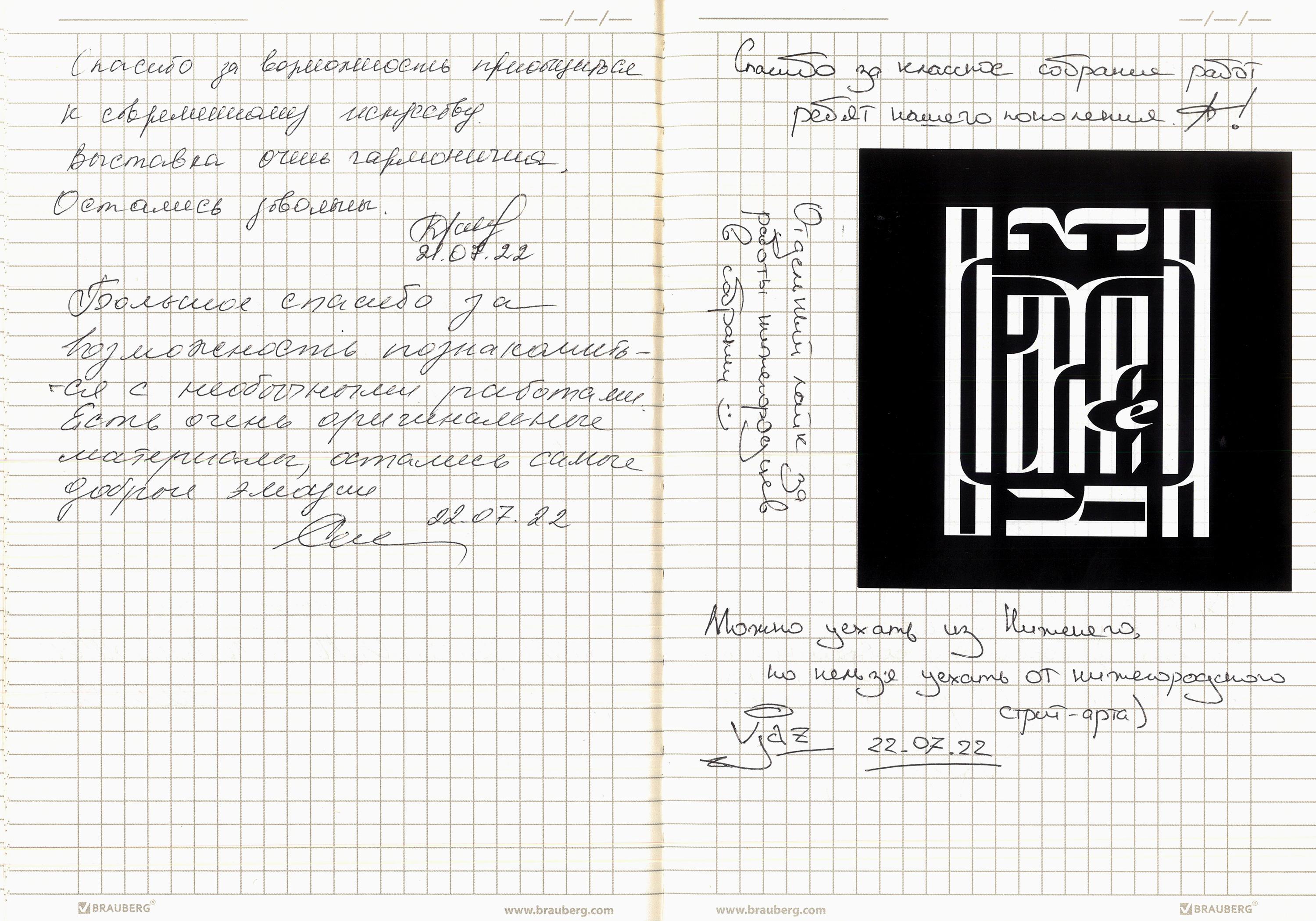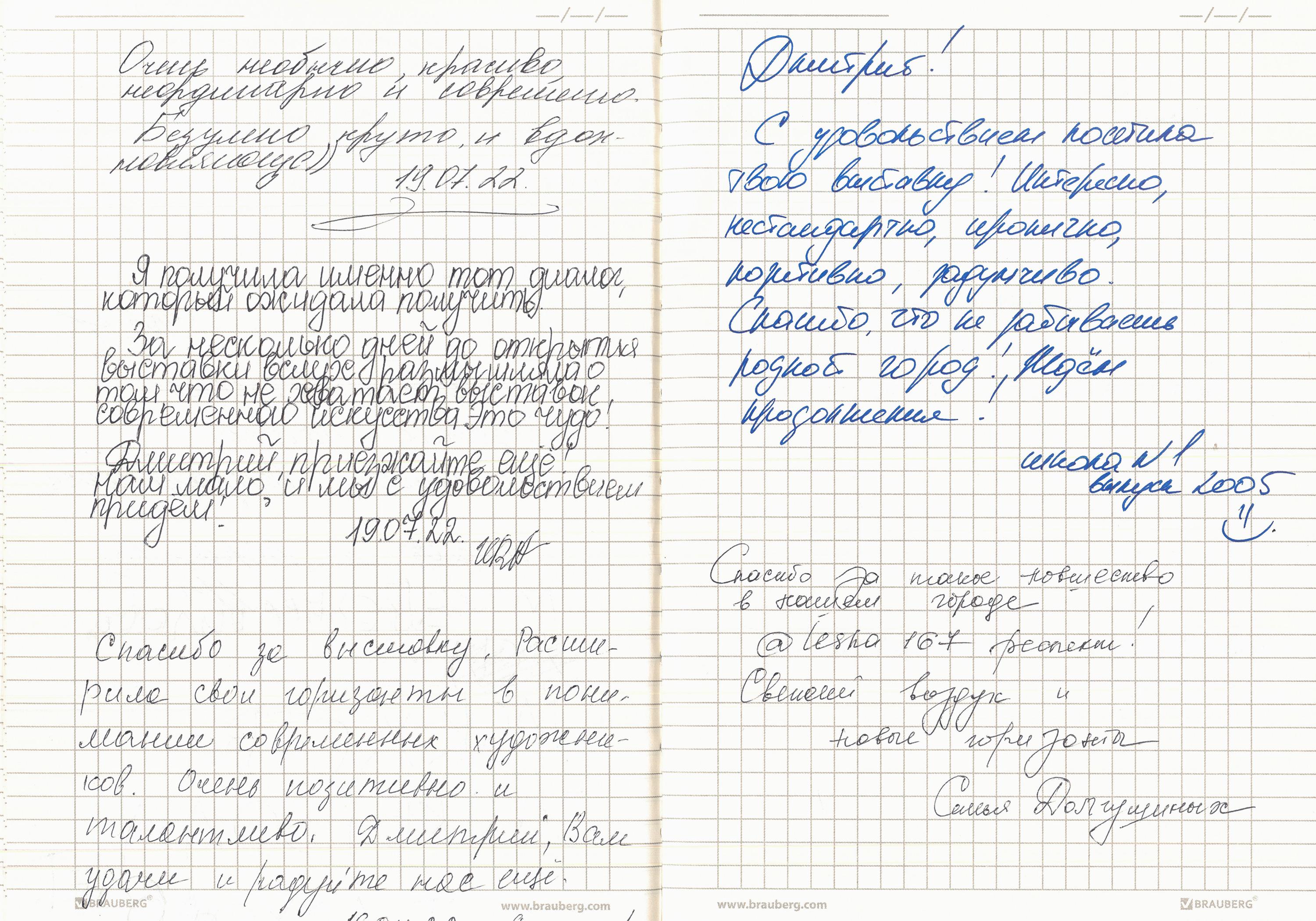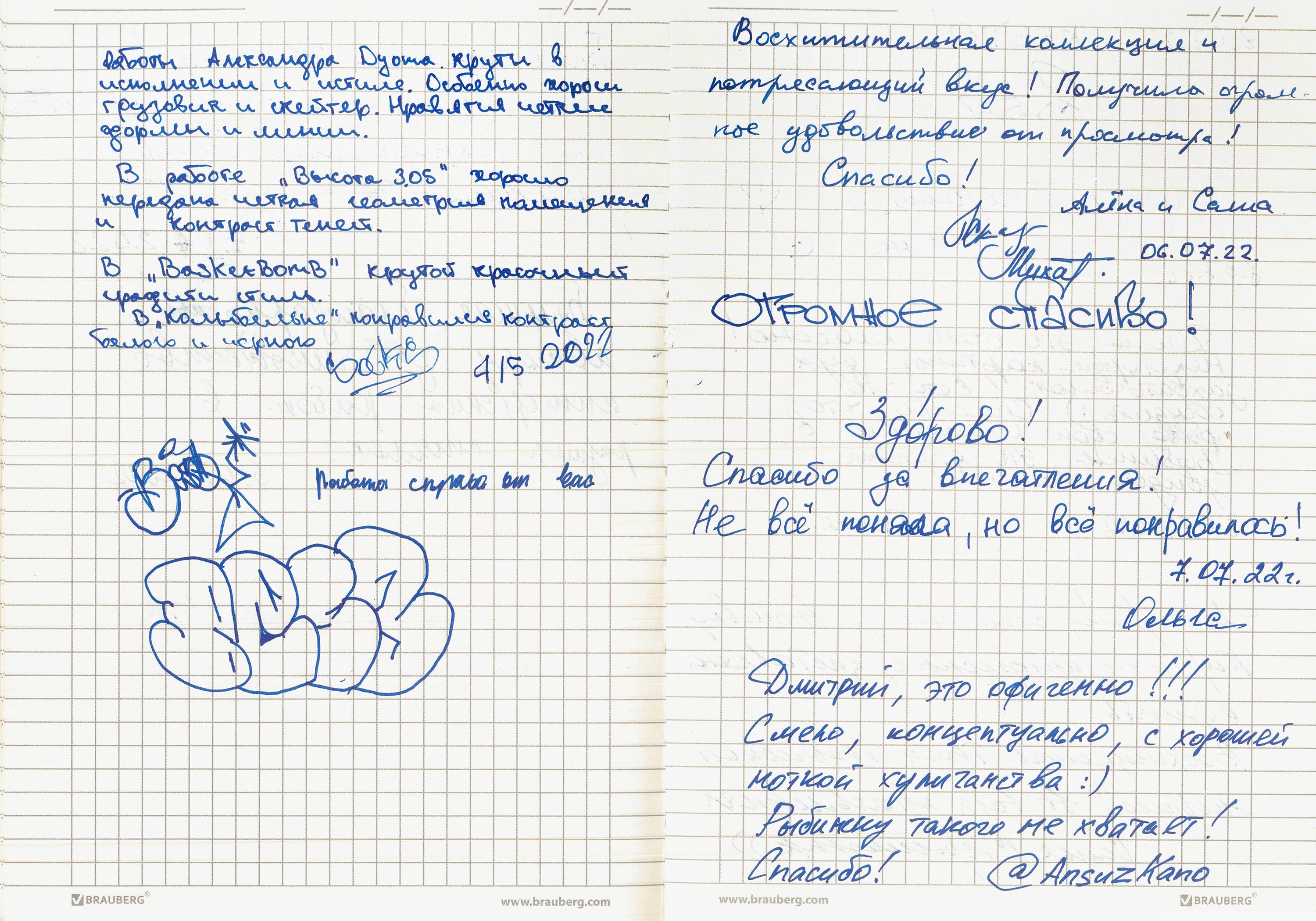 Самая популярная устная реакция на «Музейник» звучала приблизительно так: «В Рыбинске нечего делать, духота, а тут такое современное событие — класс! Сильно не хватает такого». Очень понятная история. В Москве во время «Квартирника», кажется, никто не жаловался на недостаток событийности. Также на выставке я решил положить блокнот для посетителей, которым проще формулировать свои мысли в письменной форме. Вот некоторые развороты из него: